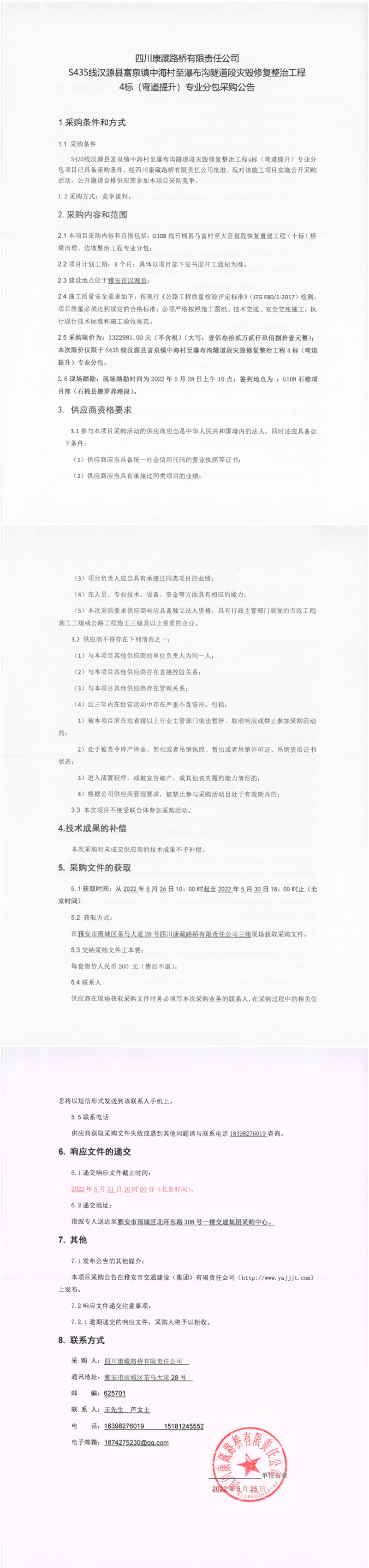 四川康藏路橋有限責(zé)任公司S435線漢源縣富泉鎮(zhèn)中海村至瀑布溝隧道段災(zāi)毀修復(fù)整治工程4標(彎道提升)專業(yè)分包采購公告