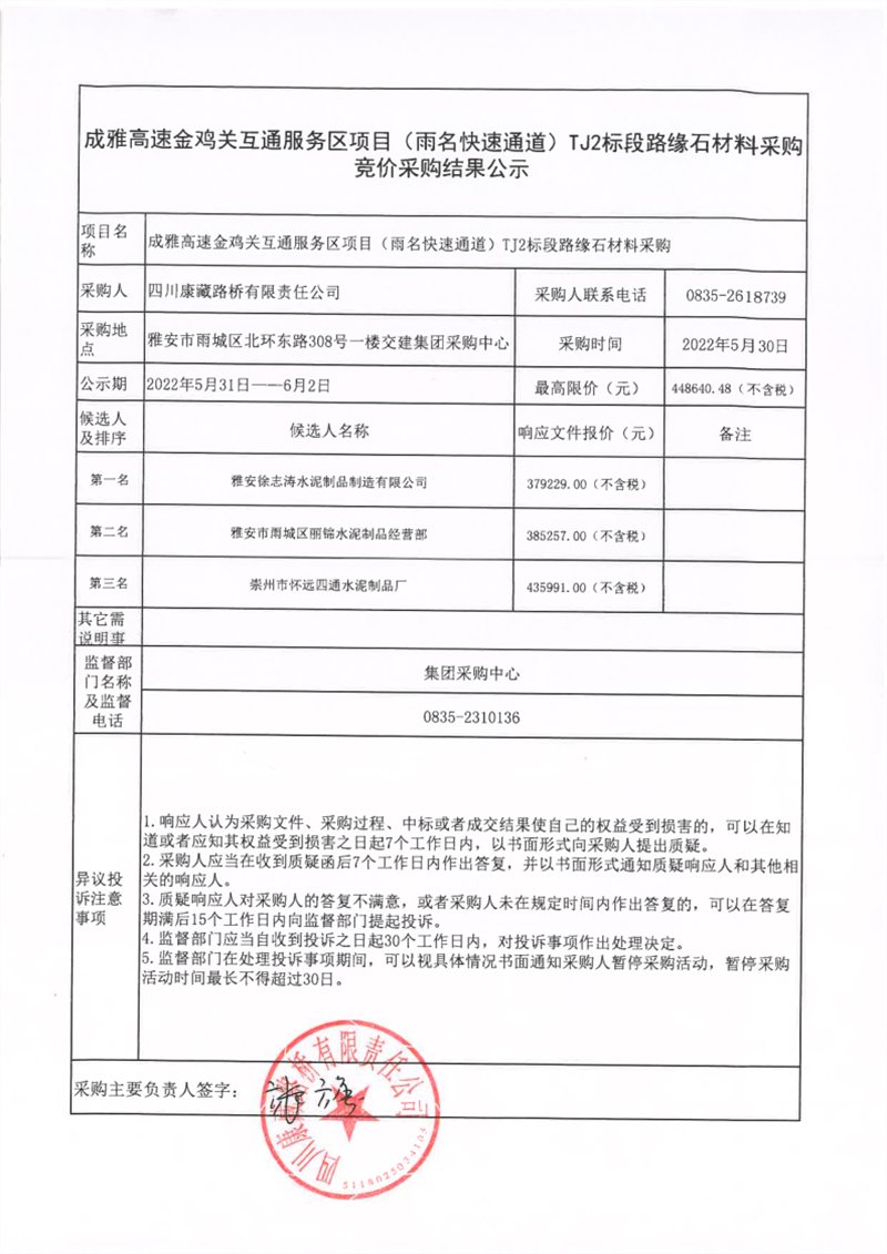 四川康藏路橋有限責(zé)任公司成雅高速金雞關(guān)互通服務(wù)區(qū)項(xiàng)目(雨名快速通道)TJ2標(biāo)段路緣石材料采購競(jìng)價(jià)采購結(jié)果公示