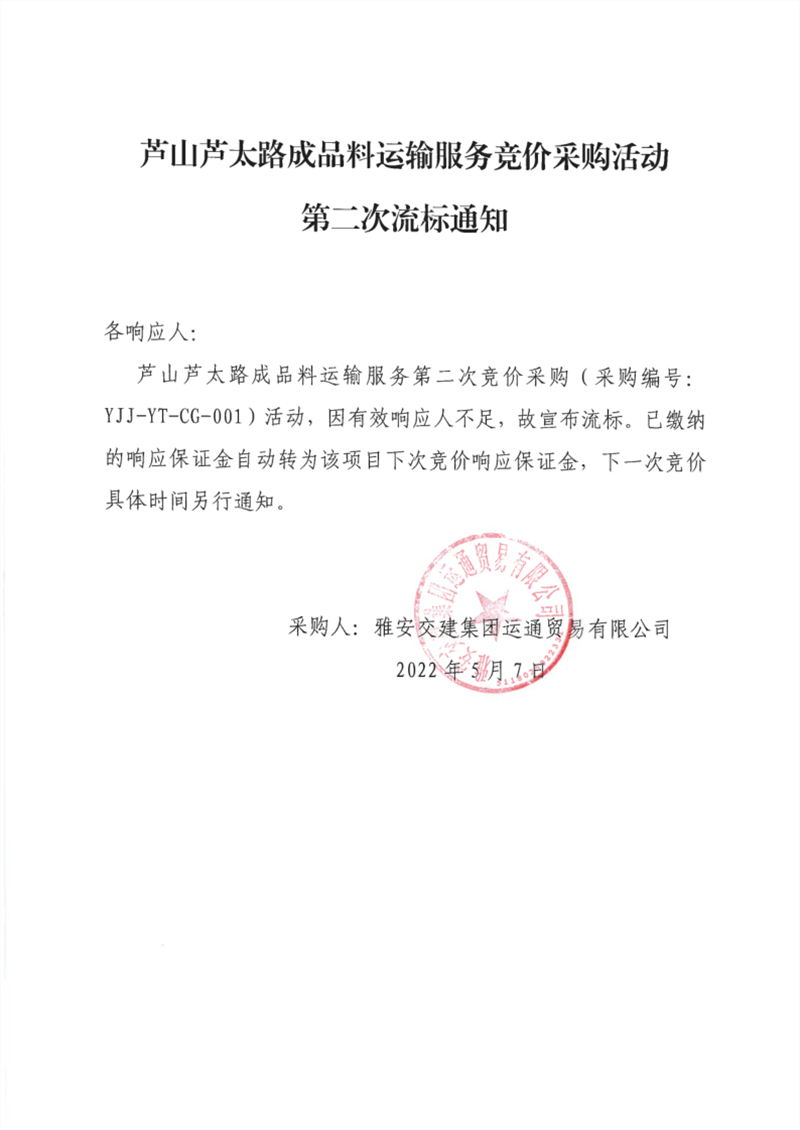 雅安交建集團(tuán)運(yùn)通貿(mào)易有限公司蘆山蘆太路成品料運(yùn)輸服務(wù)競(jìng)價(jià)采購(gòu)活動(dòng)第二次流標(biāo)通知