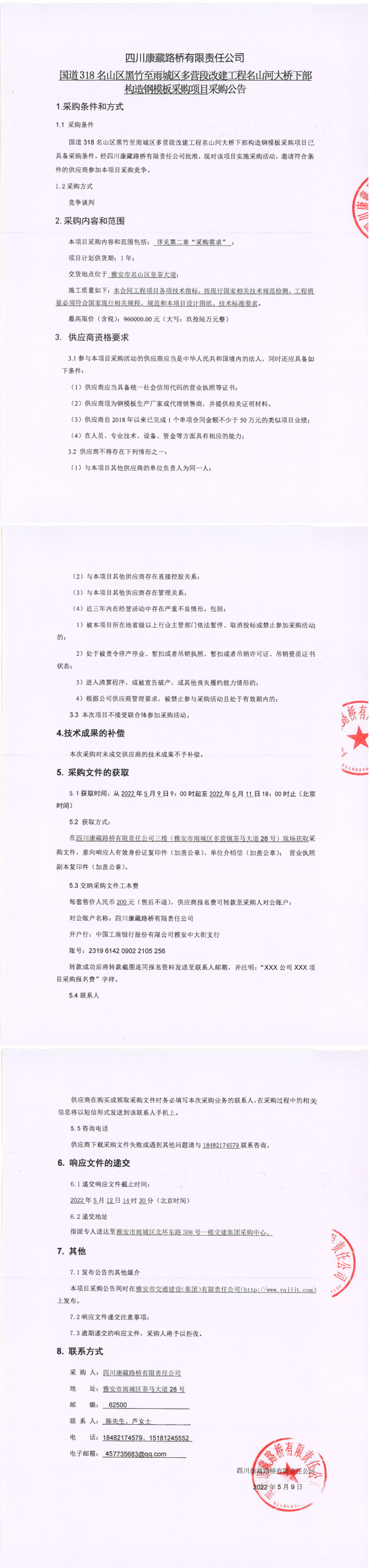 四川康藏路橋有限責(zé)任公司國道318名山區(qū)黑竹至雨城區(qū)多營段改建工程名山河大橋下部構(gòu)造鋼模塊采購項目采購公告