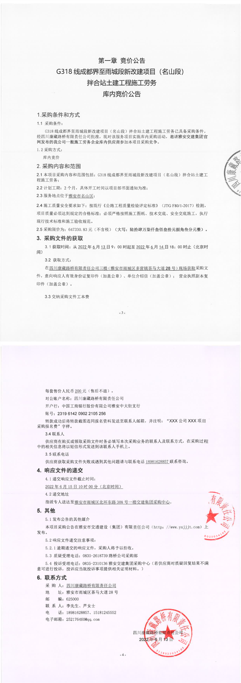 四川康藏路橋有限責(zé)任公司G318線成都界至雨城段新改建項(xiàng)目(名山段)拌合站土建工程施工勞務(wù)庫內(nèi)競價(jià)公告