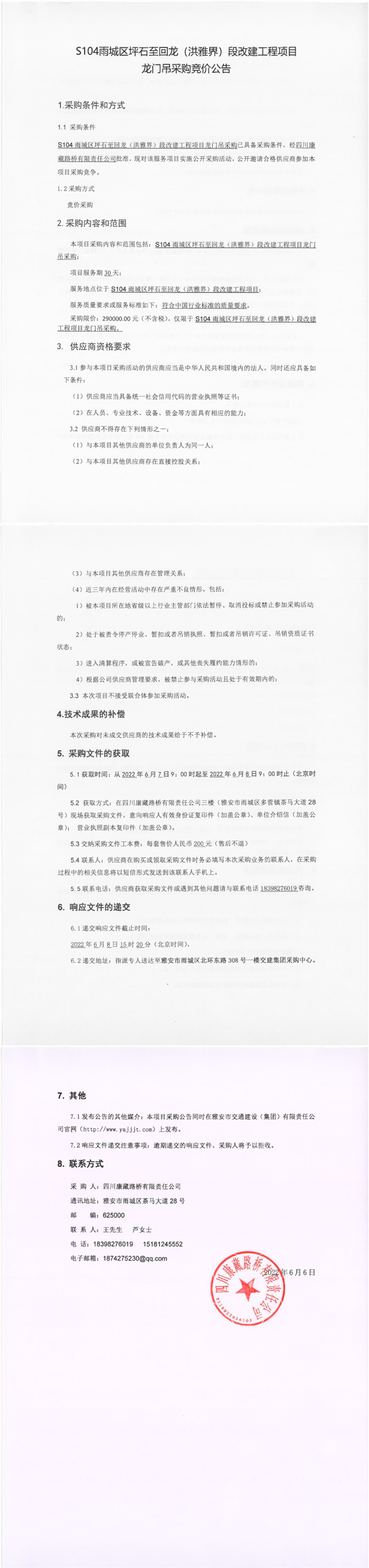 四川康藏路橋有限責(zé)任公司S104雨城區(qū)坪石至回龍(洪雅界)段改建工程項目龍門吊采購競價公告