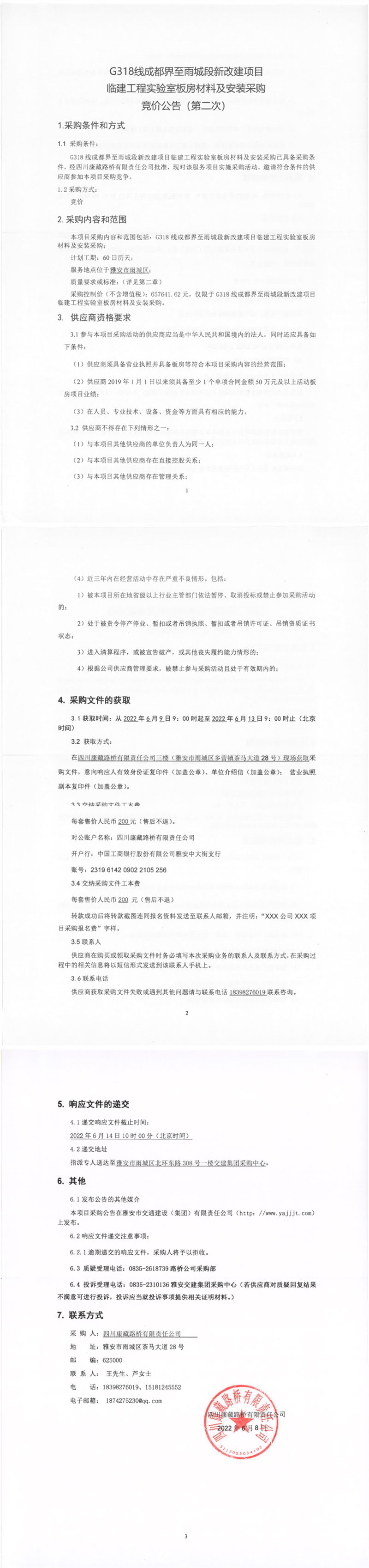 四川康藏路橋有限責(zé)任公司G318線成都界至雨城段新改建項(xiàng)目臨建工程實(shí)驗(yàn)室板房材料及安裝采購競(jìng)價(jià)公告(第二次)
