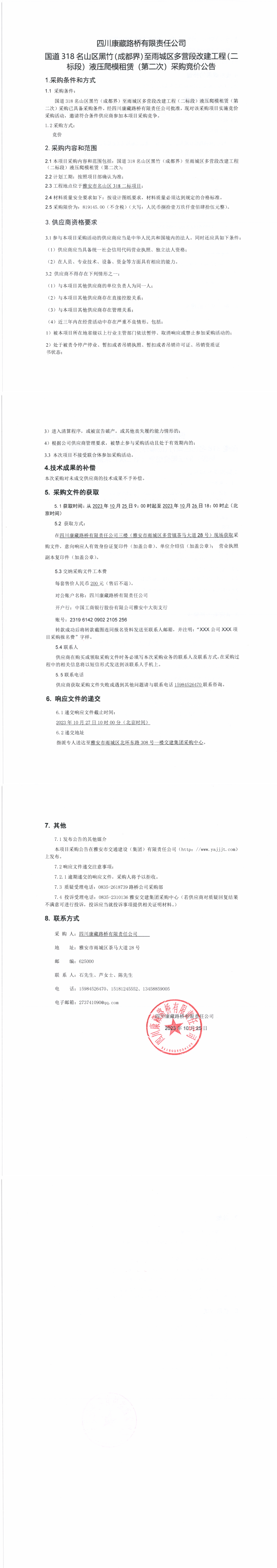 四川康藏路橋有限責任公司國道318名山區(qū)黑竹(成都界)至雨城區(qū)多營段改建工程二標段液壓爬模租賃(第二次)采購競價公告
