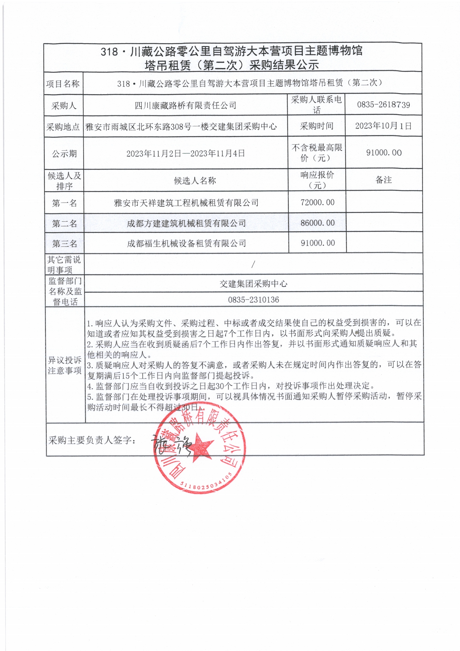 四川康藏路橋有限責(zé)任公司318·川藏公路零公里自駕游大本營項(xiàng)目主題博物館塔吊租賃(第二次)采購結(jié)果公示