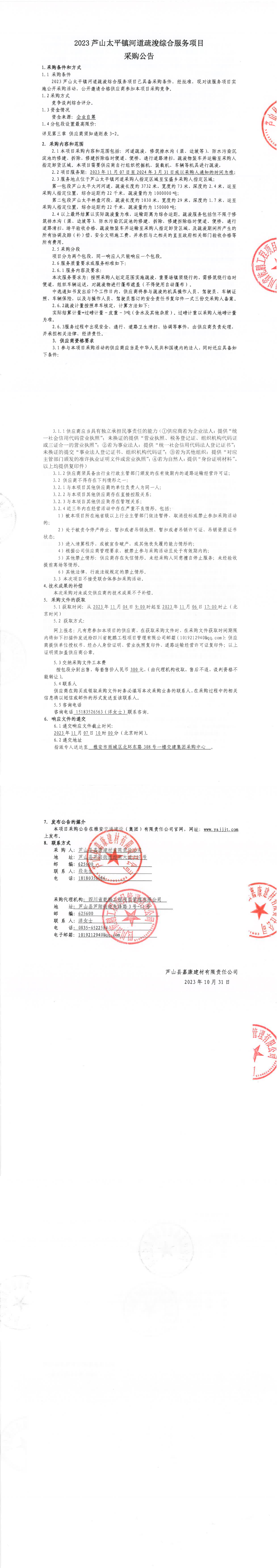 蘆山縣嘉康建材有限責任公司2023蘆山太平鎮(zhèn)河道疏浚綜合服務項目采購公告
