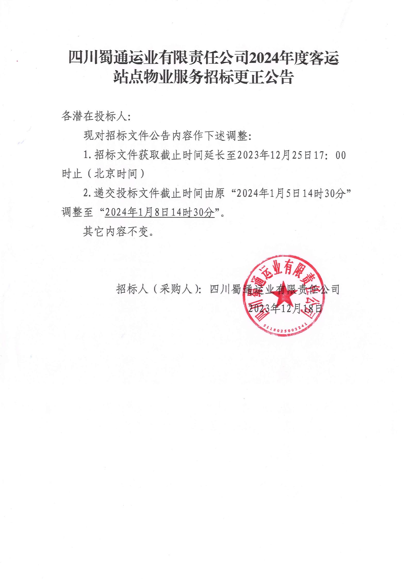 四川蜀通運業(yè)有限責(zé)任公司2024年度客運站點物業(yè)服務(wù)招標更正公告