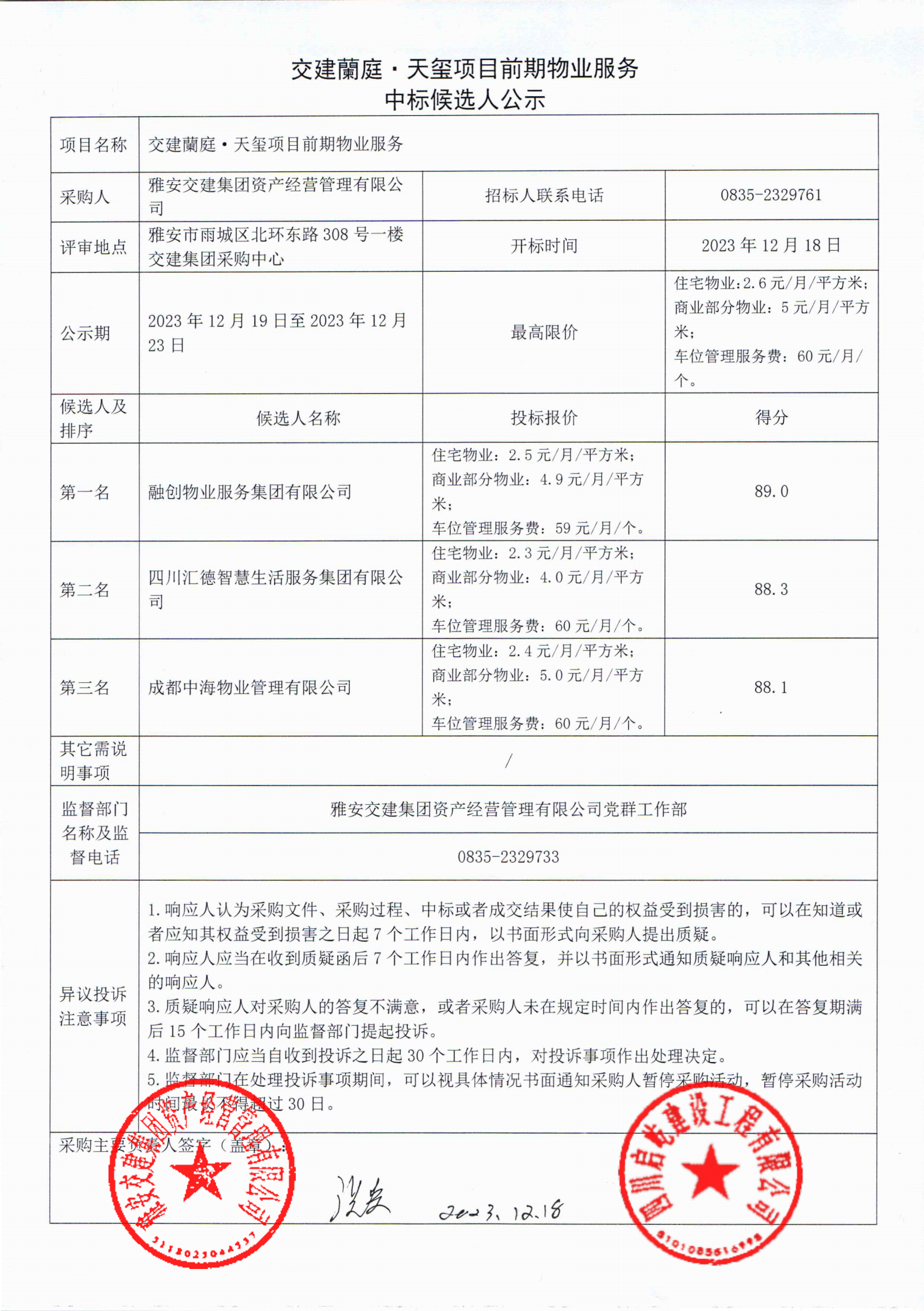 雅安交建集團資產經營管理有限公司交建蘭庭·天璽項目前期物業(yè)服務中標候選人公示