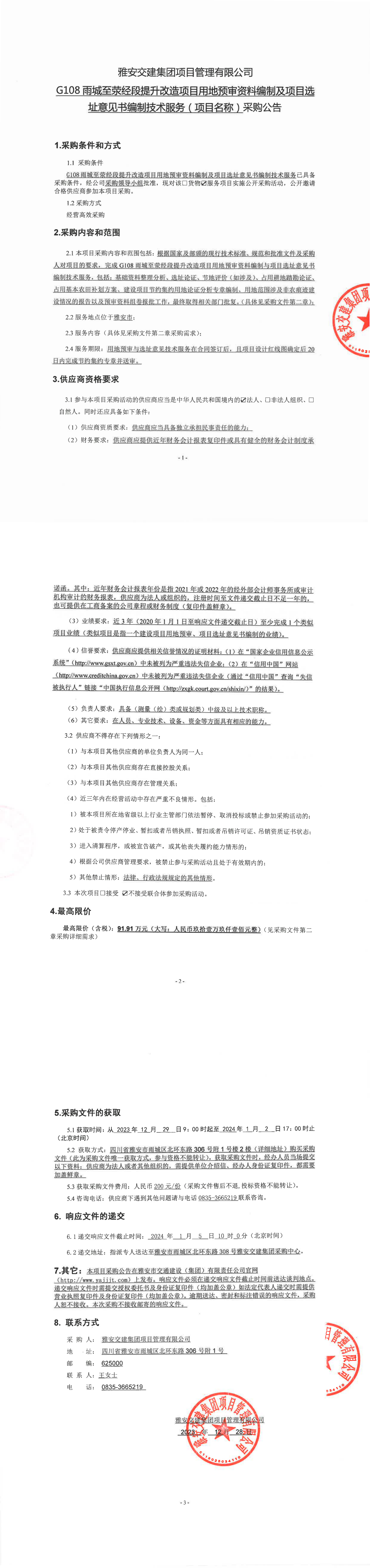 雅安交建集團(tuán)項(xiàng)目管理有限公司G108雨城至滎經(jīng)段提升改造項(xiàng)目用地預(yù)審資料編制及項(xiàng)目選址意見書編制技術(shù)服務(wù)(項(xiàng)目名稱)采購(gòu)公告