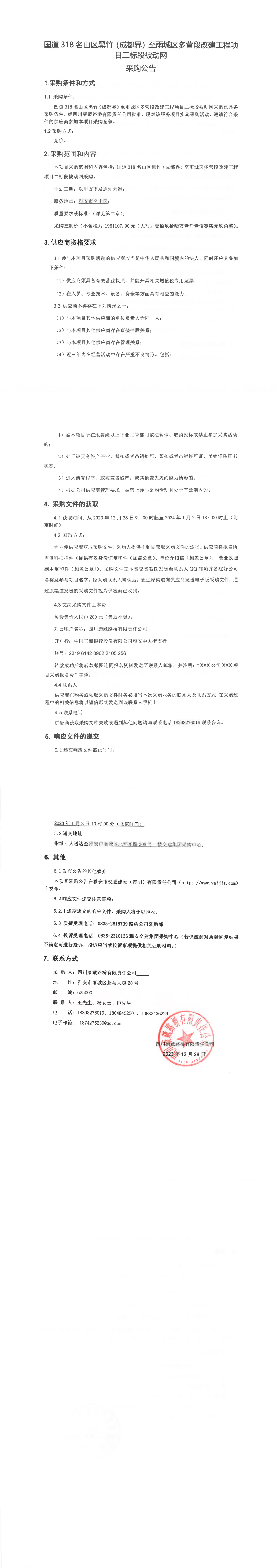 四川康藏路橋有限責(zé)任公司國(guó)道318名山區(qū)黑竹(成都界)至雨城區(qū)多營(yíng)段改建工程項(xiàng)目二標(biāo)段被動(dòng)網(wǎng)采購(gòu)公告