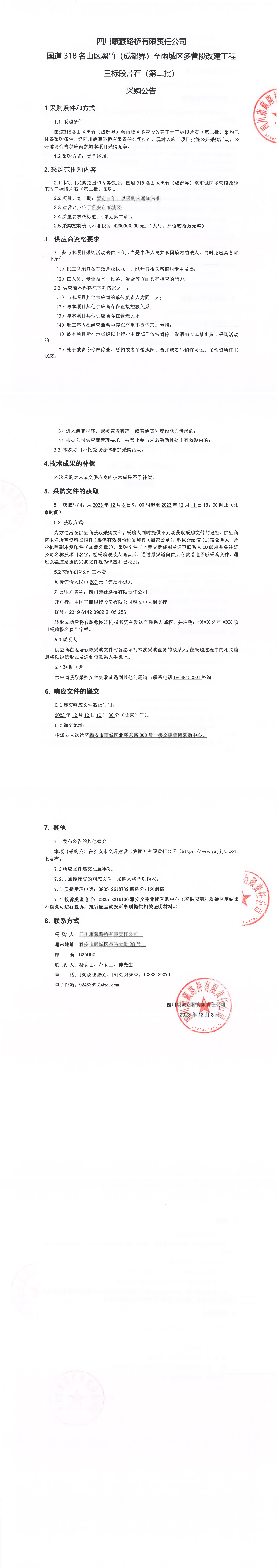 四川康藏路橋有限責(zé)任公司國(guó)道318名山區(qū)黑竹(成都界)至雨城區(qū)多營(yíng)段改建工程三標(biāo)段片石(第二批)采購公告