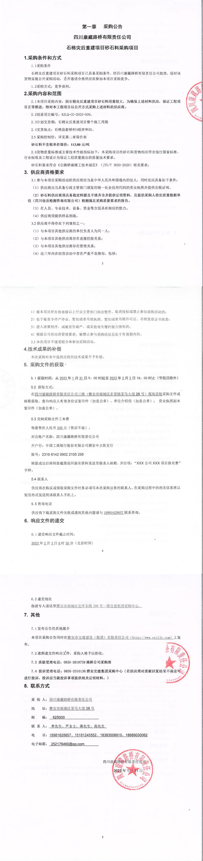 四川康藏路橋有限責任公司石棉災后重建項目砂石料采購項目采購公告