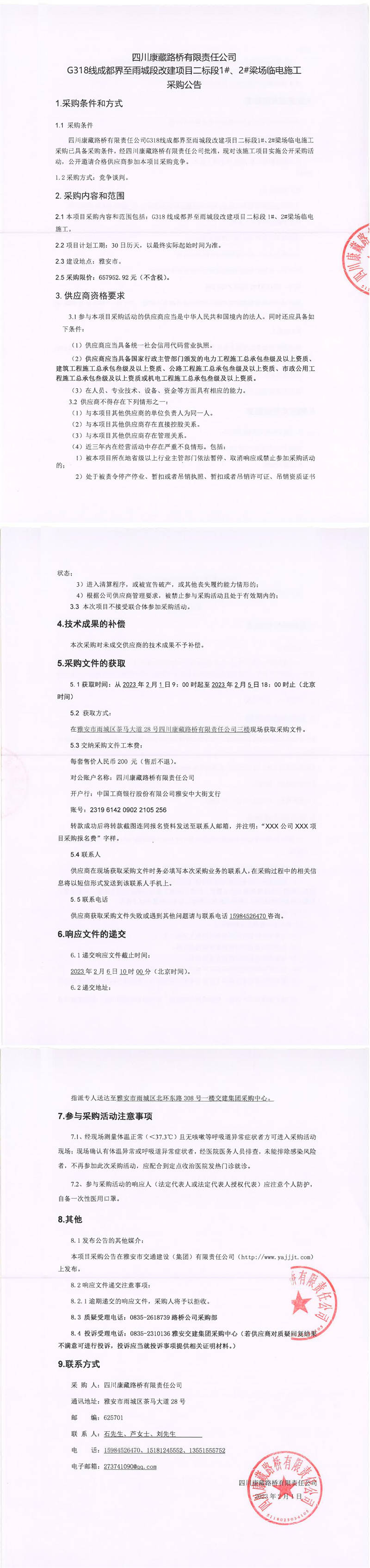 四川康藏路橋有限責(zé)任公司G318線(xiàn)成都界至雨城段改建項(xiàng)目二標(biāo)段1#、2#梁場(chǎng)臨電施工采購(gòu)公告