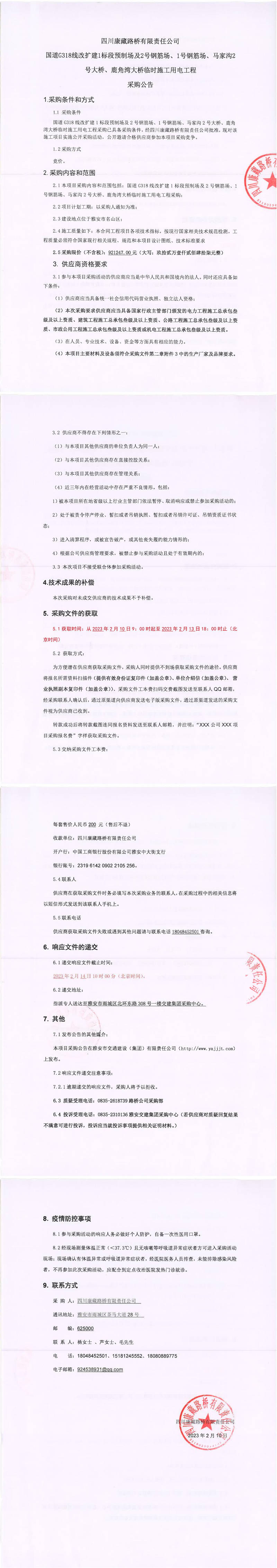 四川康藏路橋有限責(zé)任公司國道G318線改擴建1標(biāo)段預(yù)制場及2號鋼筋場、1號鋼筋場、馬家溝2號大橋、鹿角灣大橋臨時施工用電工程采購公告
