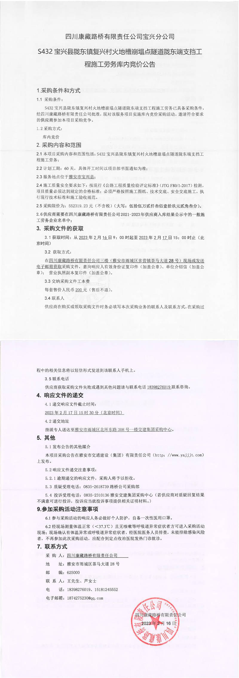 四川康藏路橋有限責(zé)任公司寶興分公司S432寶興縣隴東鎮(zhèn)復(fù)興村火地槽崩塌點(diǎn)隧道隴東端支擋工程施工勞務(wù)庫內(nèi)競價公告