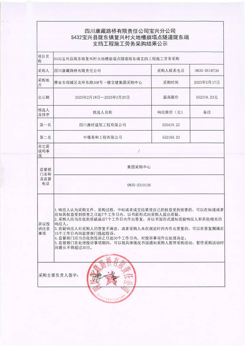 四川康藏路橋有限責任公司寶興分公司S432寶興縣隴東鎮(zhèn)復興村火地槽崩塌點隧道隴東端支擋工程勞務采購結果公示