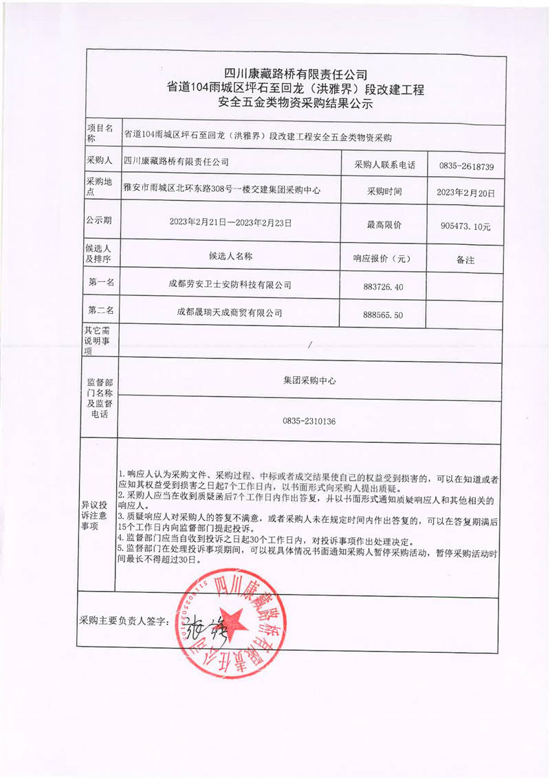 四川康藏路橋有限責任公司省道104雨城區(qū)坪石至回龍(洪雅界)段改建工程安全五金類物資采購結果公示