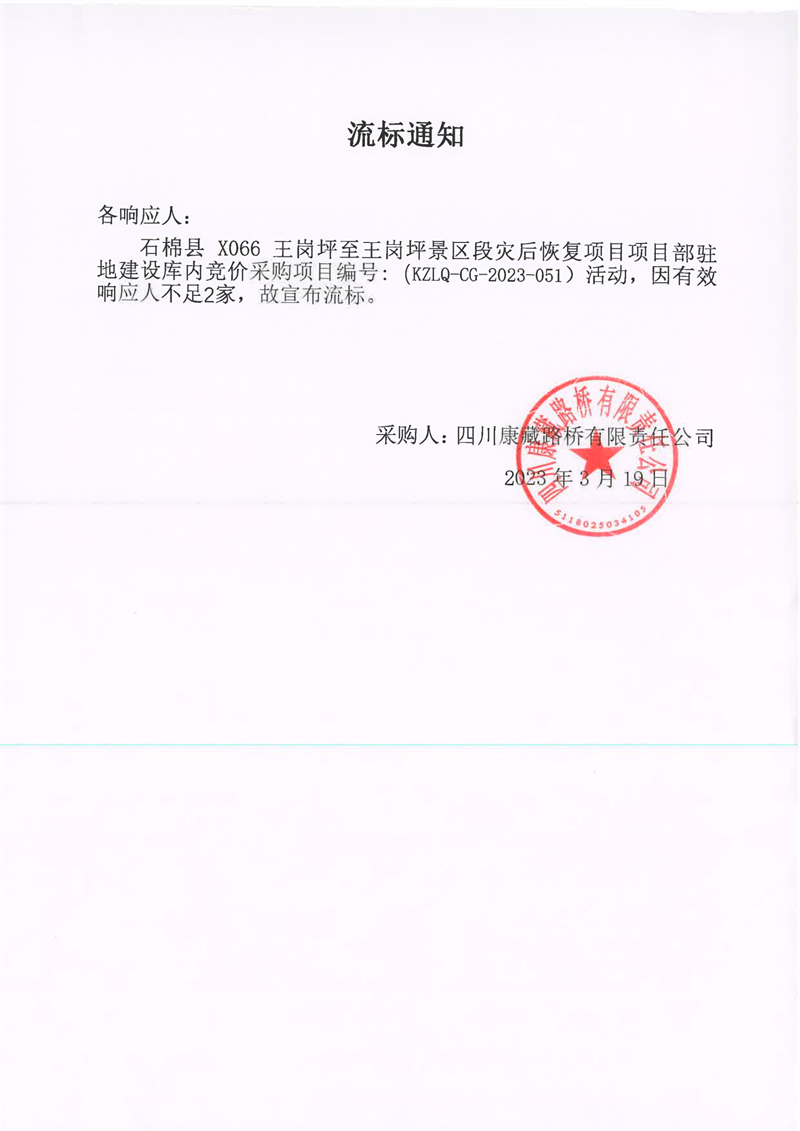 四川康藏路橋有限責(zé)任公司石棉縣X066王崗坪至王崗坪景區(qū)段災(zāi)后恢復(fù)項(xiàng)目項(xiàng)目部駐地建設(shè)庫(kù)內(nèi)競(jìng)價(jià)采購(gòu)流標(biāo)通知