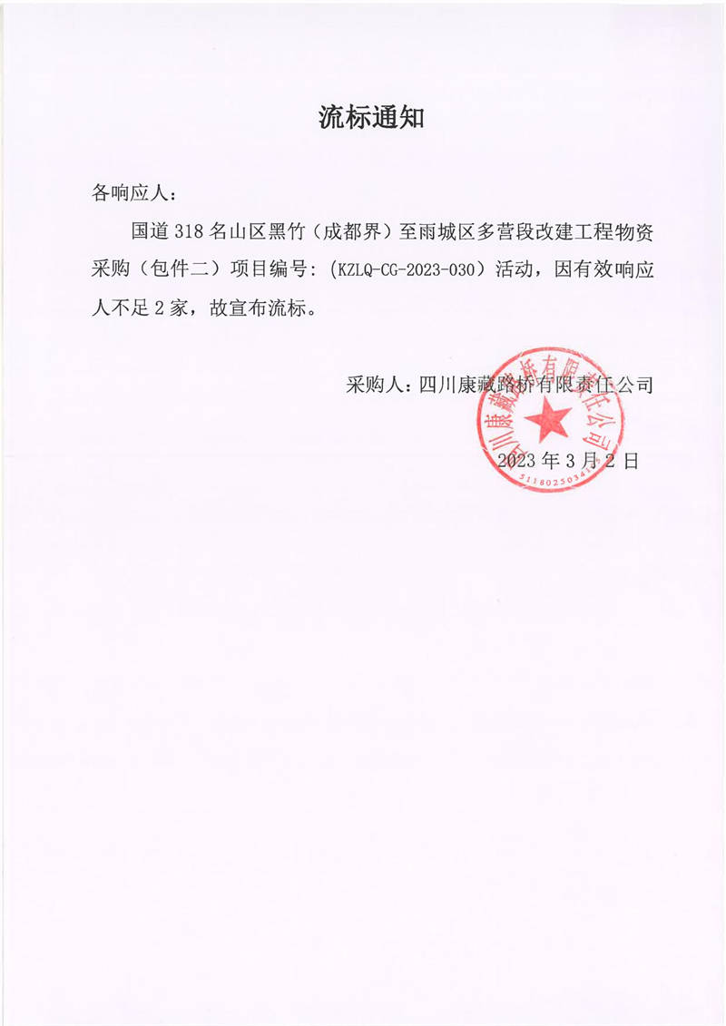 四川康藏路橋有限責(zé)任公司國道318名山區(qū)黑竹(成都界)至雨城區(qū)多營段改建工程物資采購包件2流標(biāo)通知