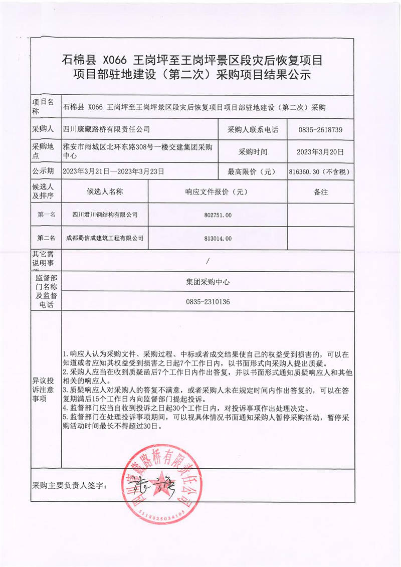 四川康藏路橋有限責(zé)任公司石棉縣X066王崗坪至王崗坪景區(qū)段災(zāi)后恢項(xiàng)目項(xiàng)目駐地建設(shè)(第二次)采購(gòu)結(jié)果公示