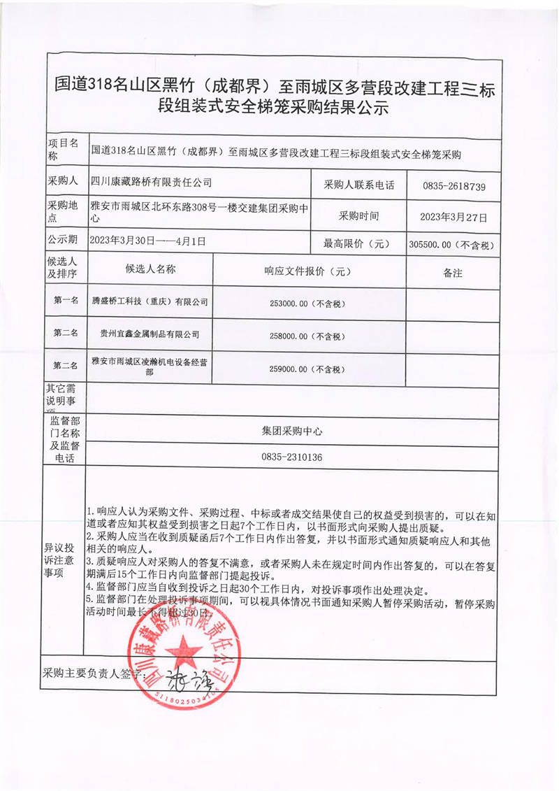 四川康藏路橋有限責(zé)任公司國道318名山區(qū)黑竹(成都界)至雨城區(qū)多營段改建工程三標(biāo)段組裝式安全梯籠采購結(jié)果公示