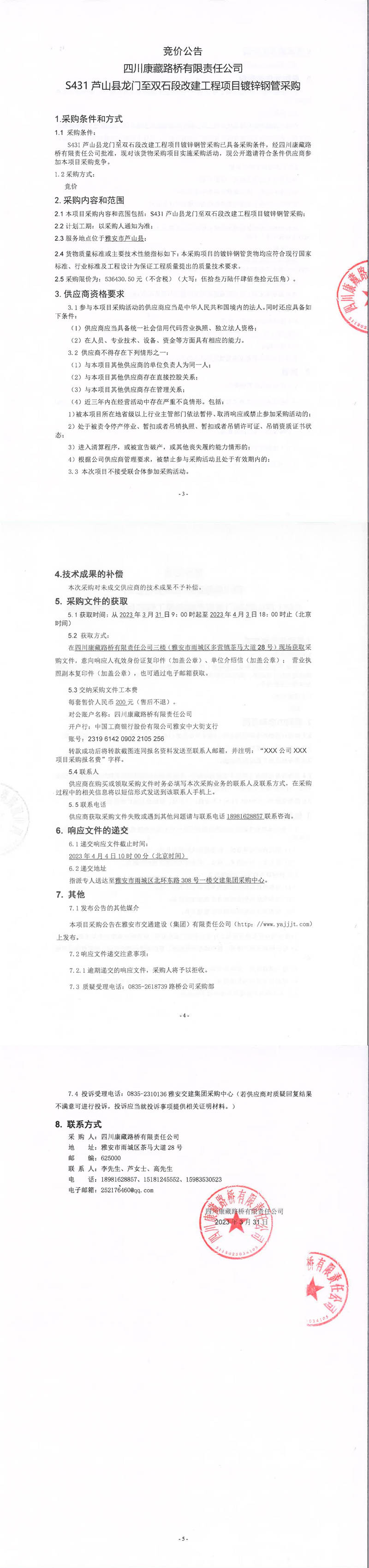 四川康藏路橋有限責任公司S431蘆山縣龍門至雙石段改建工程項目鍍鋅鋼管采購競價公告