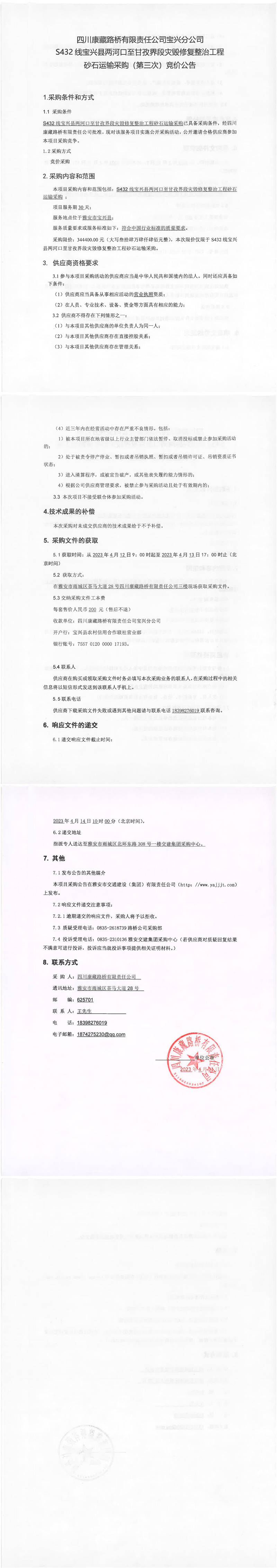 四川康藏路橋有限責任公司寶興分公司S432寶興縣兩河口至甘孜界段災毀修復整治工程砂石運輸采購(第三次)競價公告