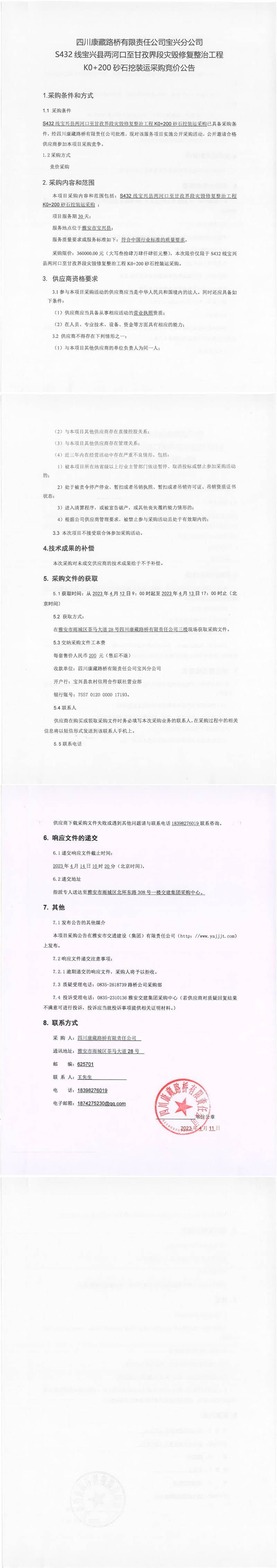 四川康藏路橋有限責(zé)任公司寶興分公司S432寶興縣兩河口至甘孜界段災(zāi)毀修復(fù)整治工程K0+200砂石挖裝運(yùn)采購競價(jià)公告