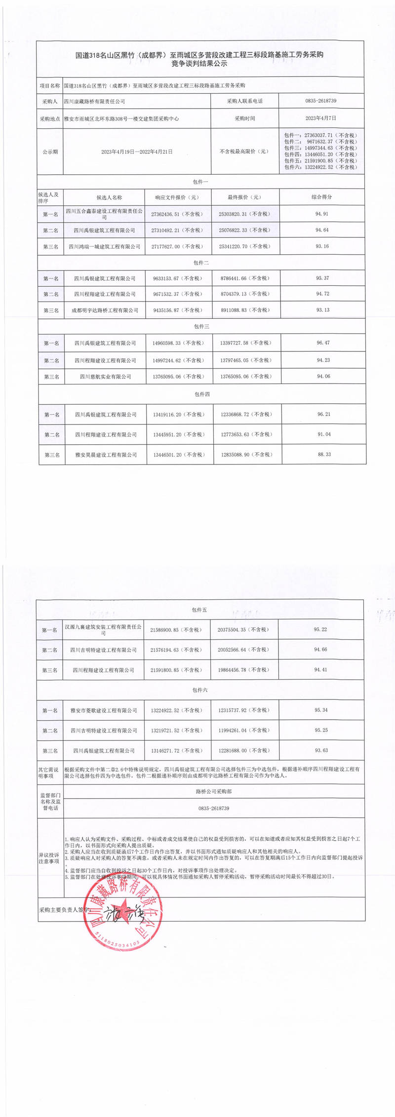 四川康藏路橋有限責(zé)任公司國道318名山區(qū)黑竹(成都界)至雨城區(qū)多營段改建工程三標(biāo)段橋梁施工勞務(wù)采購競爭談判結(jié)果公示