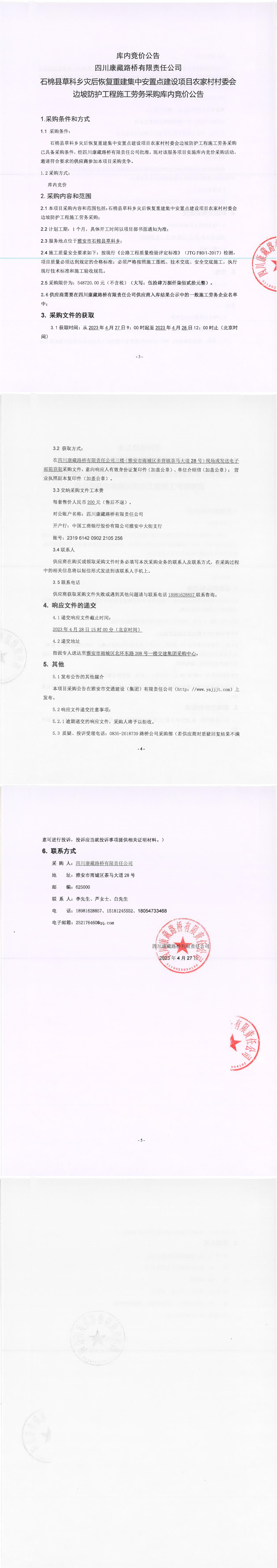 四川康藏路橋有限責任公司石棉草科鄉(xiāng)災后恢復重建集中安置點建設項目農家村村委會邊坡防護工程施工勞務采購采購庫內競價公告