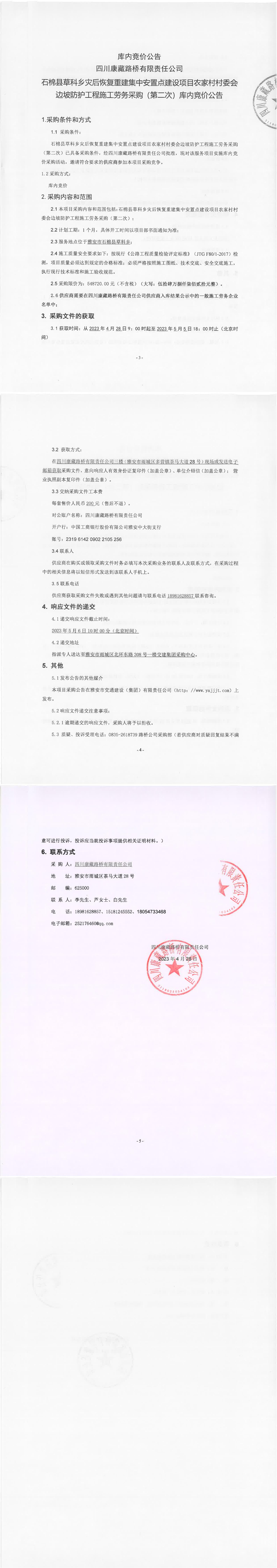 四川康藏路橋有限責(zé)任公司石棉草科鄉(xiāng)災(zāi)后恢復(fù)重建集中安置點建設(shè)項目農(nóng)家村村委會邊坡防護(hù)工程施工勞務(wù)采購(第二次)庫內(nèi)競價公告