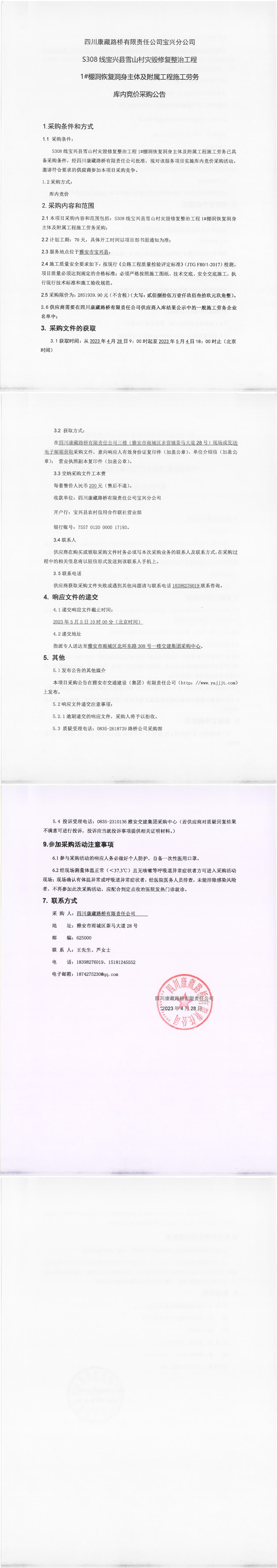 四川康藏路橋有限責(zé)任公司寶興分公司S308線寶興縣雪山村段災(zāi)毀修復(fù)整治工程1#棚洞恢復(fù)洞身主體及附屬工程施工勞務(wù)庫內(nèi)競(jìng)價(jià)采購公告