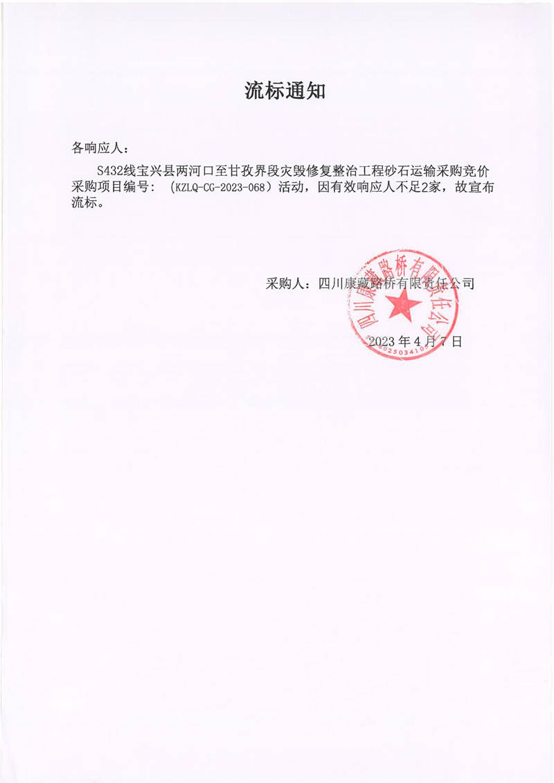 四川康藏路橋有限責(zé)任公司寶興分公司S432寶興縣兩河口至甘孜界段災(zāi)毀修復(fù)整治工程砂石運(yùn)輸采購(gòu)流標(biāo)通知