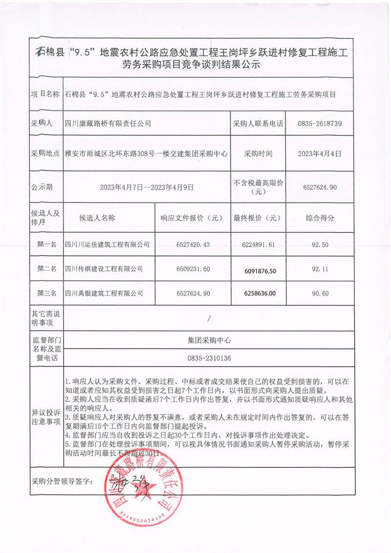 四川康藏路橋有限責(zé)任公司石棉縣“9.5”地震農(nóng)村公路應(yīng)急處置工程王崗坪鄉(xiāng)躍進村修復(fù)工程施工勞務(wù)采購項目競爭談判結(jié)果公示