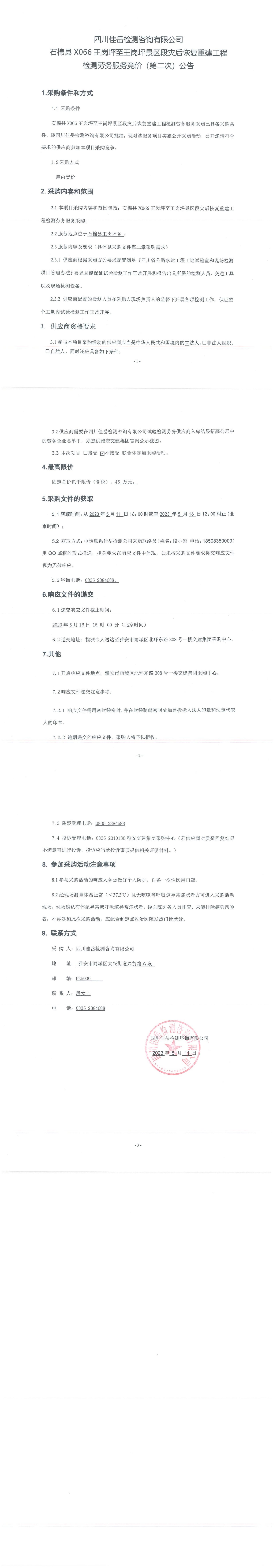 四川佳岳檢測咨詢有限公司石棉縣X066王崗坪至王崗坪景區(qū)段災(zāi)后恢復(fù)重建工程檢測勞務(wù)服務(wù)競價(第二次)采購公告