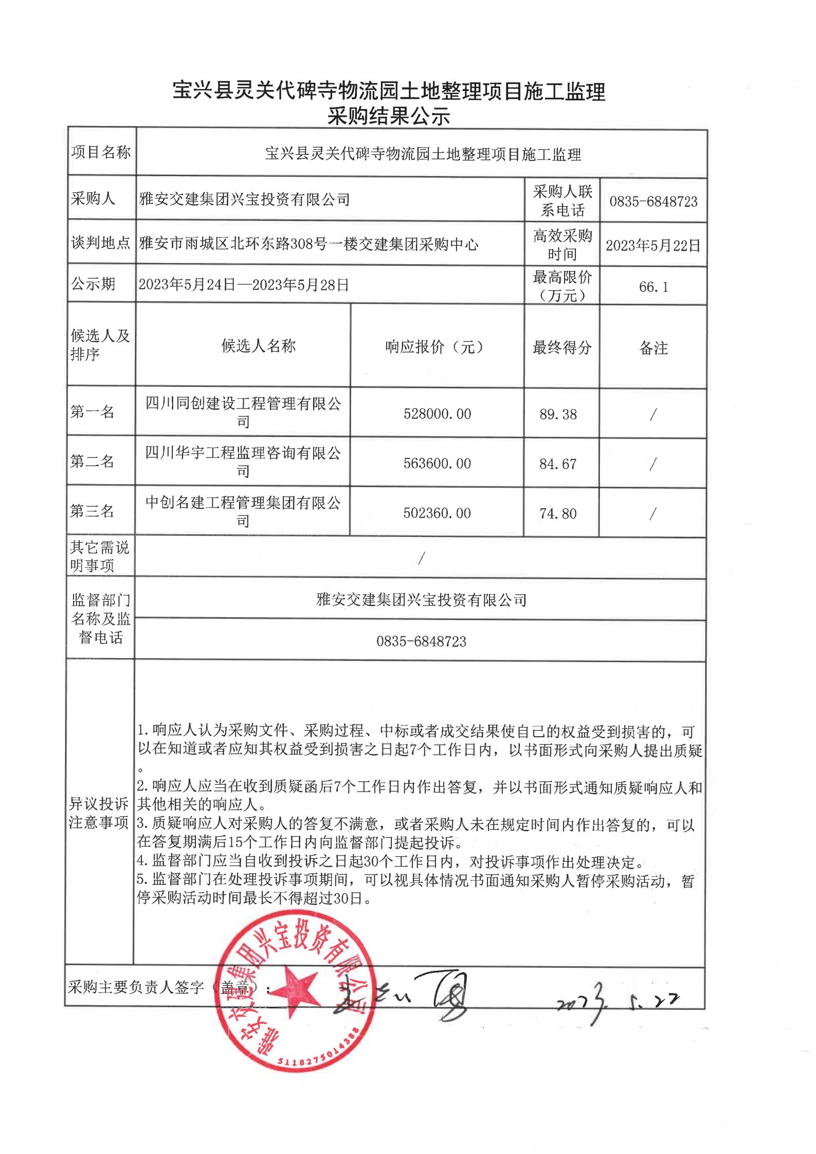 雅安交建集團(tuán)興寶投資有限公司寶興縣靈關(guān)代碑寺物流園土地整理項(xiàng)目施工監(jiān)理采購結(jié)果公示