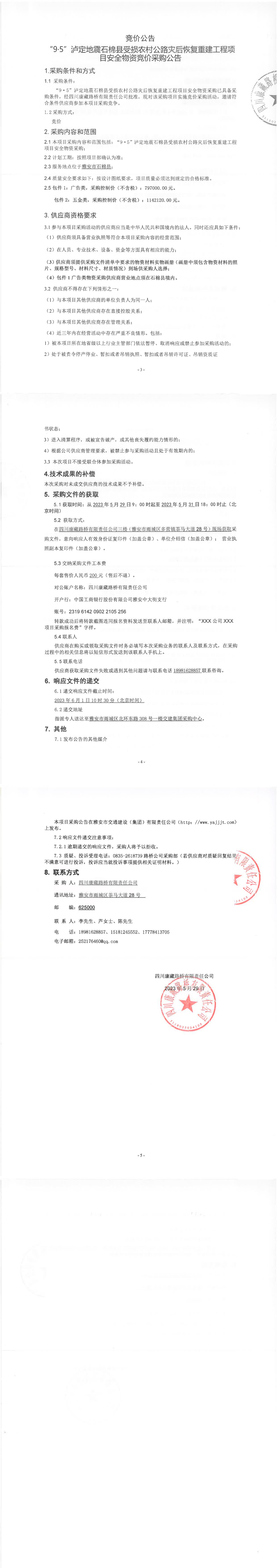 四川康藏路橋有限責任公司“9.5”瀘定地震石棉縣受損農村公路災后恢復重建工程項目安全物資競價采購公告