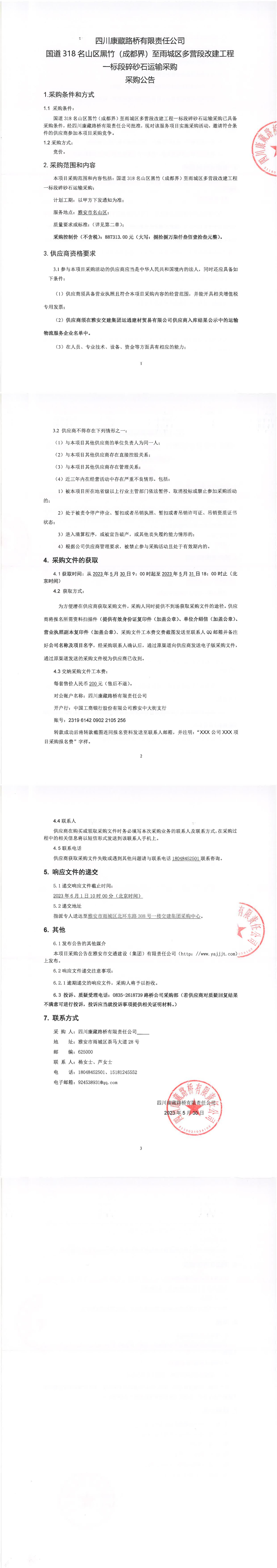 四川康藏路橋有限責任公司國道318名山區(qū)黑竹(成都界)至雨城區(qū)多營段改建工程一標段碎砂石運輸采購公告