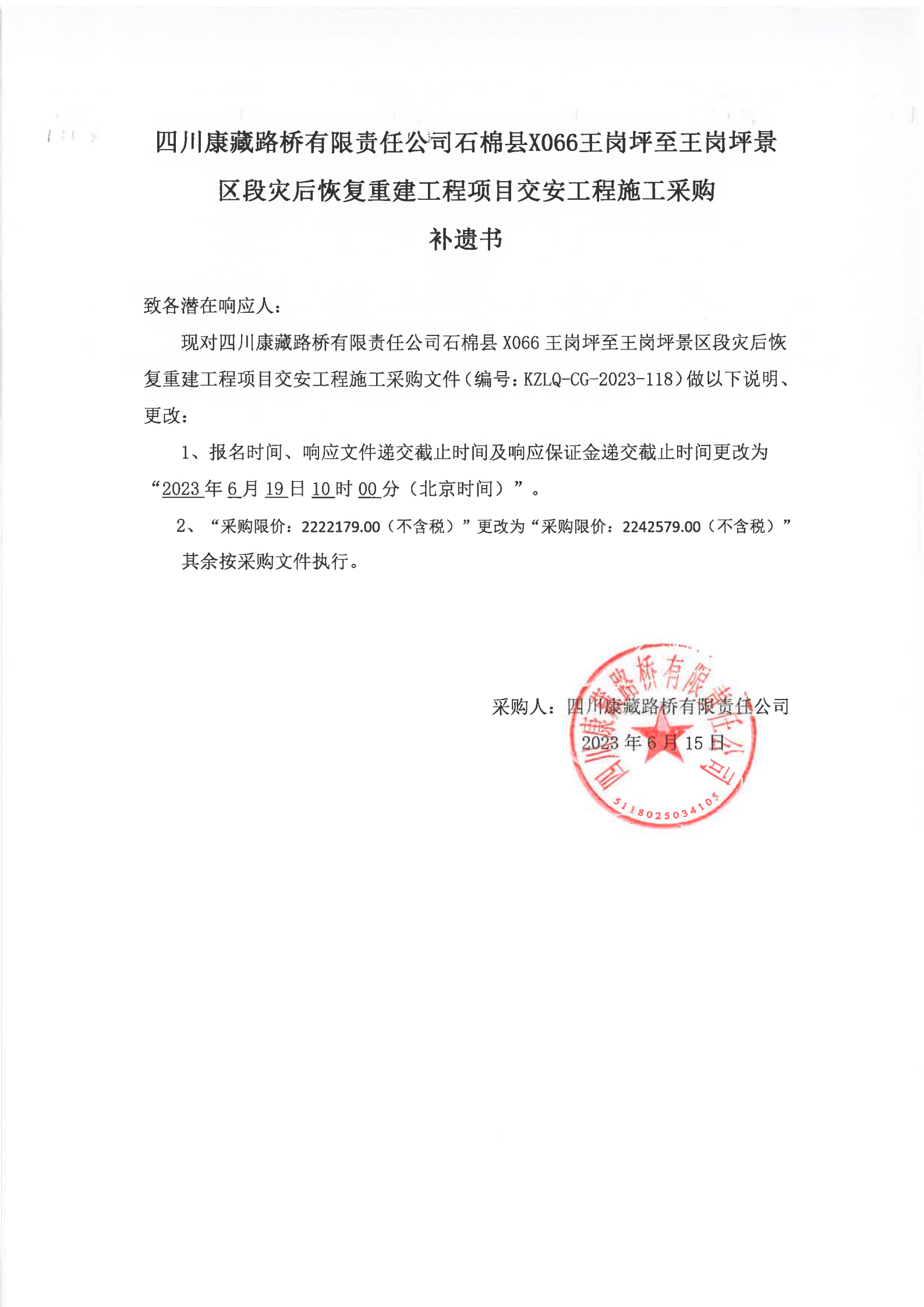 四川康藏路橋有限責(zé)任公司石棉縣X066王崗坪至王崗坪景區(qū)段災(zāi)后恢復(fù)重建工程項(xiàng)目交安工程施工補(bǔ)遺書(shū)