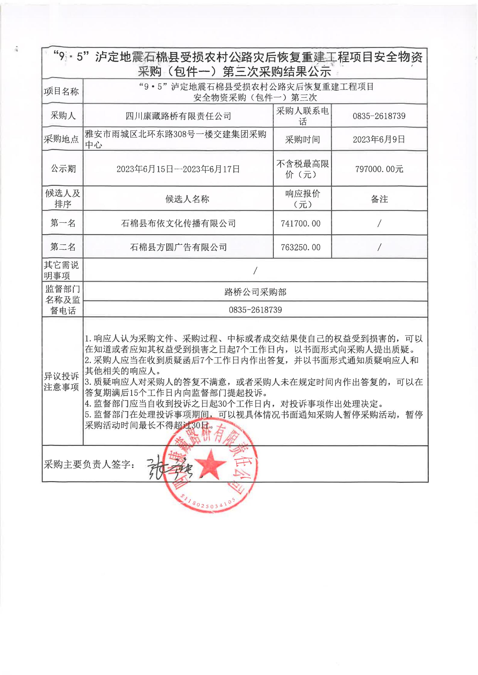 四川康藏路橋有限責(zé)任公司“9·5”瀘定地震石棉縣農(nóng)村公路災(zāi)后恢復(fù)重建工程項目安全物資采購(包件一)第三次采購結(jié)果公示