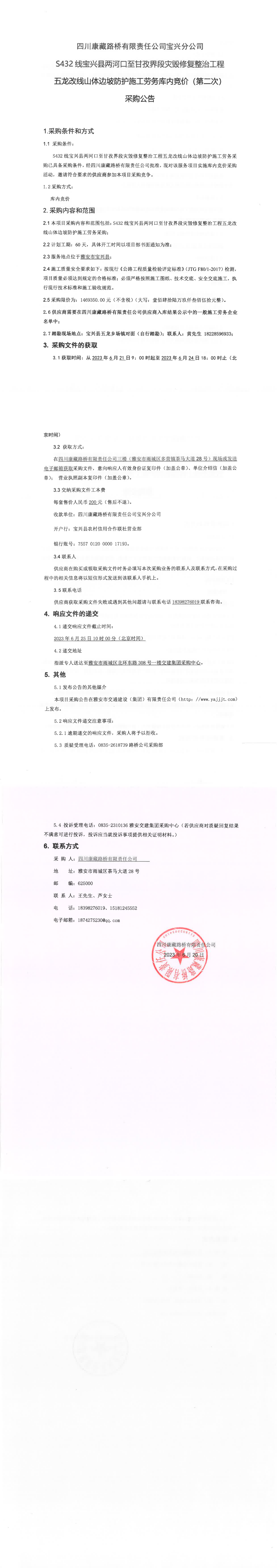 四川康藏路橋有限責任公司寶興分公司S432線寶興縣兩河口至甘孜界段災毀修復整治工程五龍改線山體邊坡防護施工勞務庫內競價(第二次)采購公告