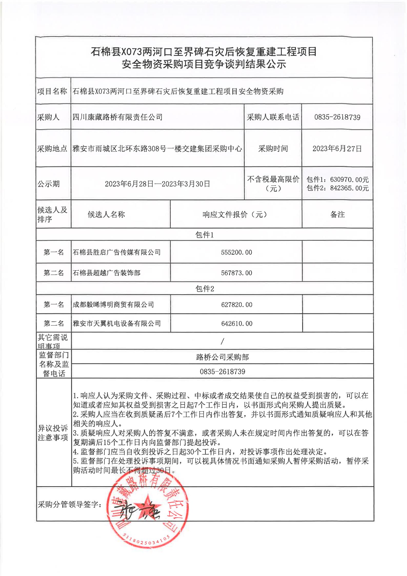 四川康藏路橋有限責任公司石棉縣X073兩河口至界碑石災后恢復重建工程項目安全物資采購項目競爭談判結(jié)果公示