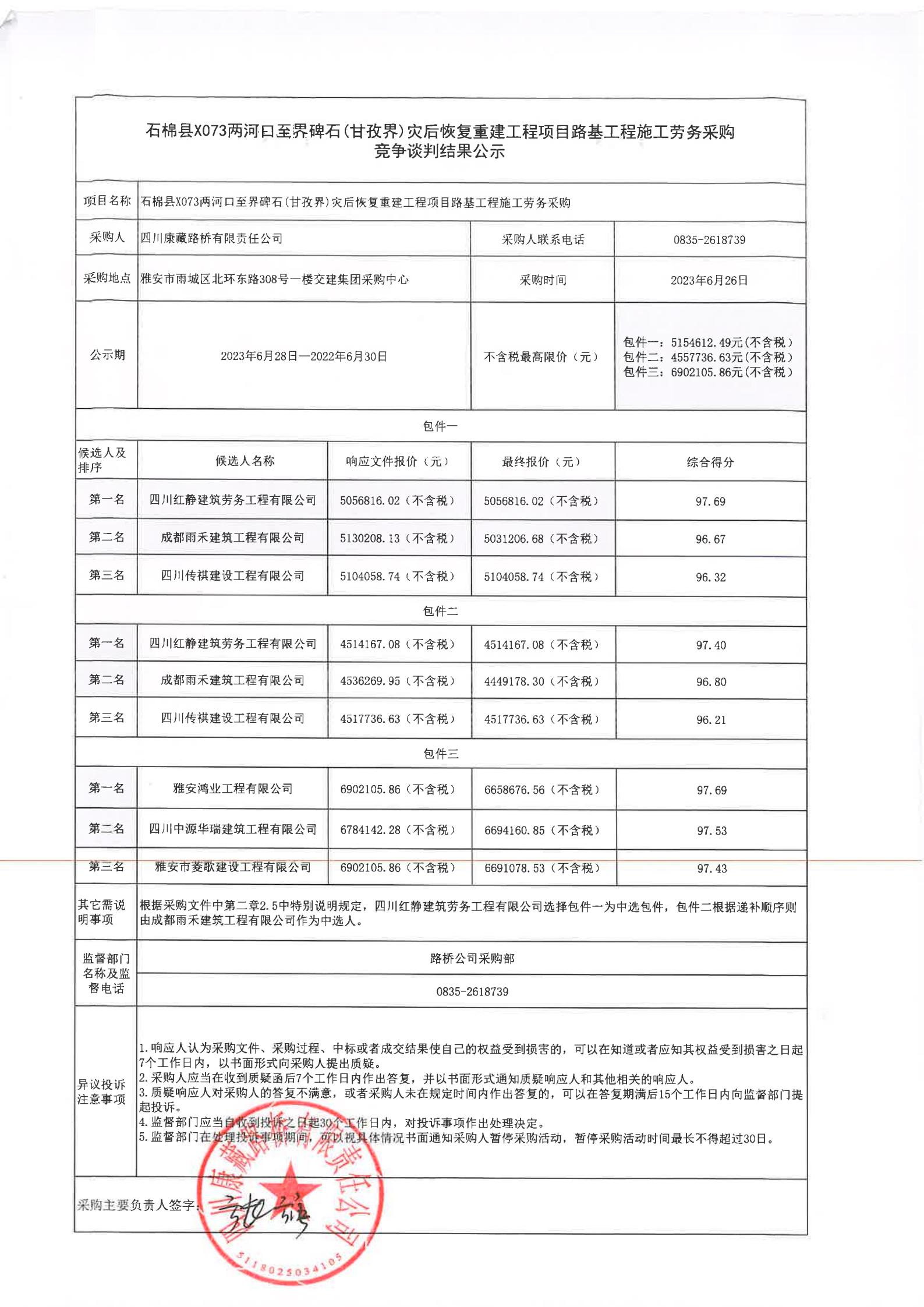 四川康藏路橋有限責(zé)任公司石棉縣X073兩河口至界碑石(甘孜界)災(zāi)后恢復(fù)重建工程項(xiàng)目路基工程施工勞務(wù)采購競(jìng)爭(zhēng)談判結(jié)果公示