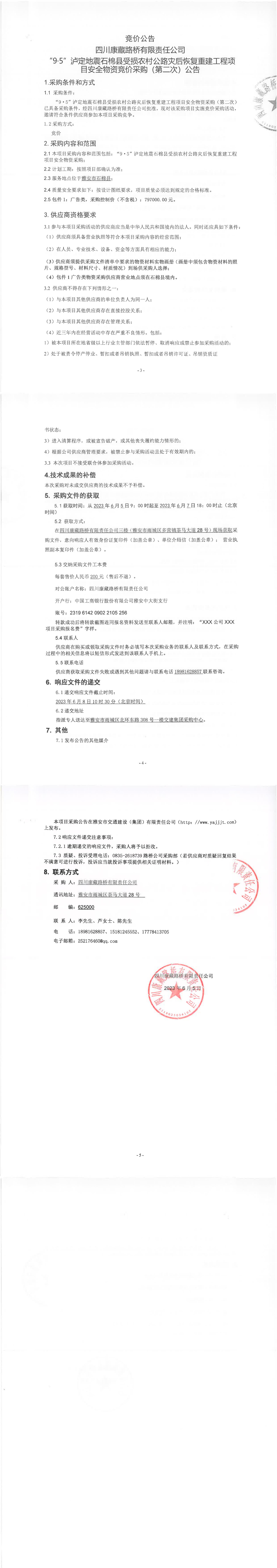 四川康藏路橋有限責(zé)任公司“9·5”瀘定地震石棉縣受損農(nóng)村公路災(zāi)后恢復(fù)重建工程項(xiàng)目安全物資競(jìng)價(jià)采購(gòu)(第二次)公告