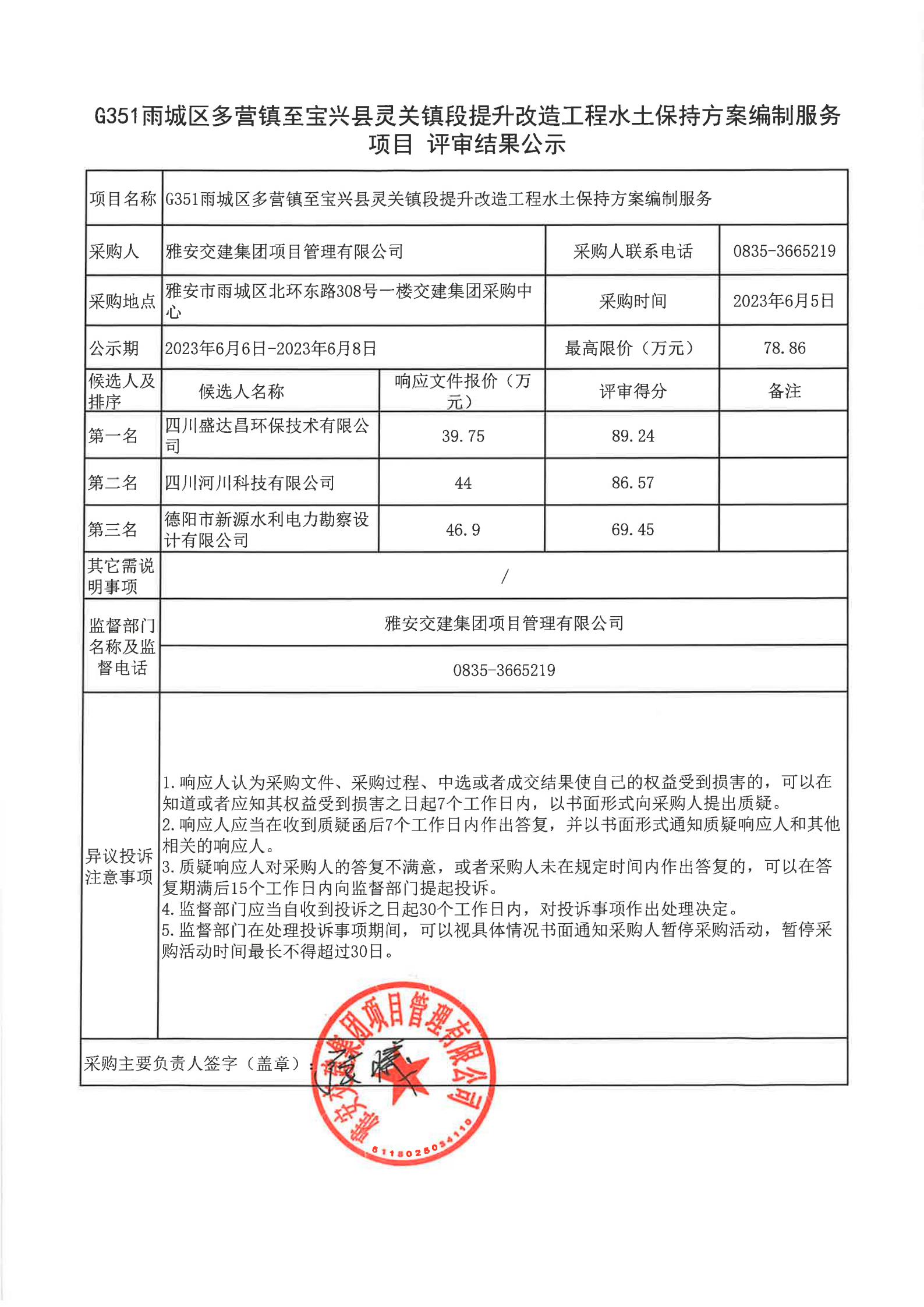 雅安交建集團(tuán)項(xiàng)目管理有限公司G351雨城區(qū)多營鎮(zhèn)至寶興縣靈關(guān)鎮(zhèn)段提升改造工程水土保持方案編制服務(wù)項(xiàng)目評審結(jié)果公示