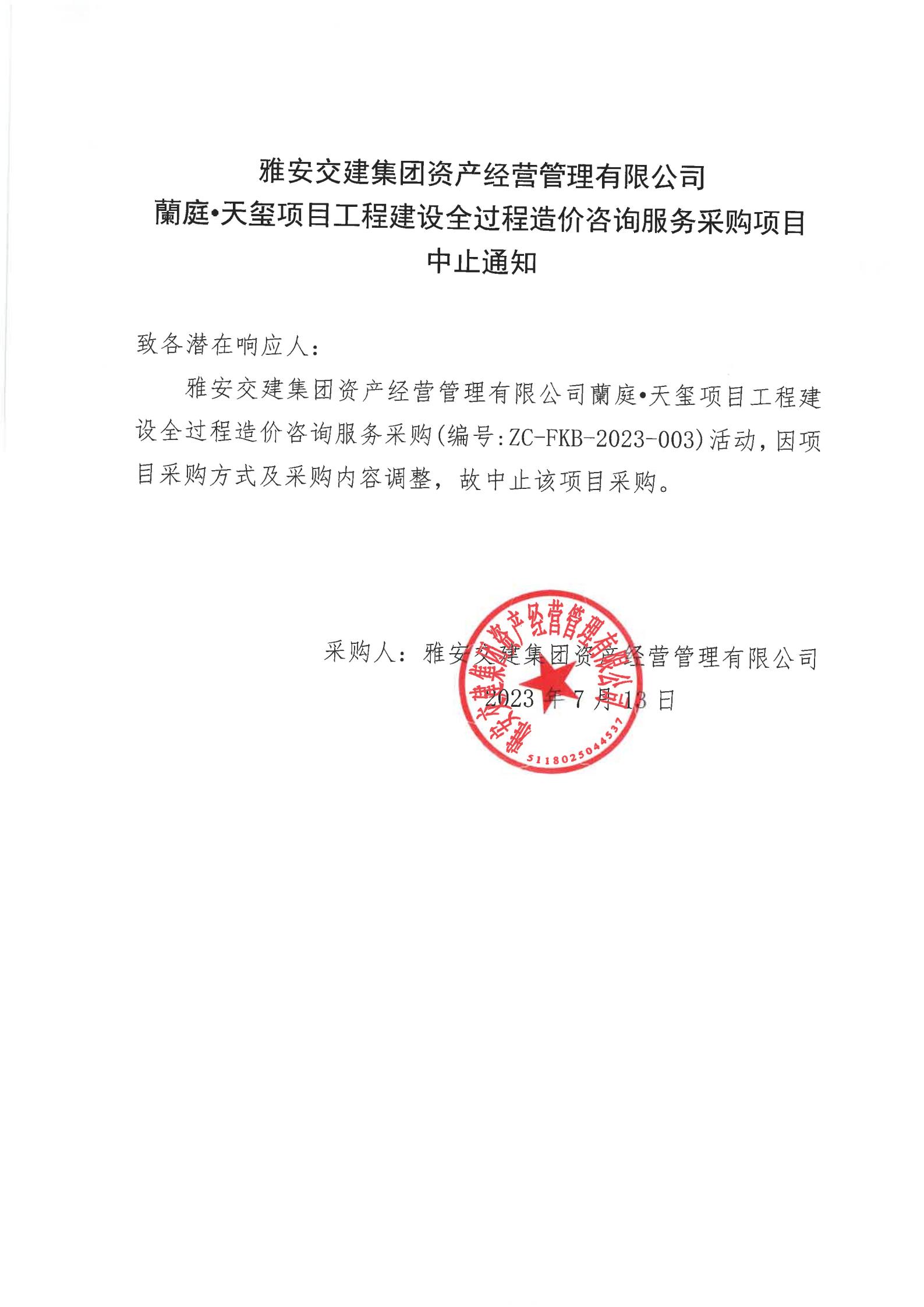 雅安交建集團(tuán)資產(chǎn)經(jīng)營(yíng)管理有限公司蘭庭·天璽項(xiàng)目工程建設(shè)全過(guò)程造價(jià)咨詢服務(wù)采購(gòu)項(xiàng)目中止通知