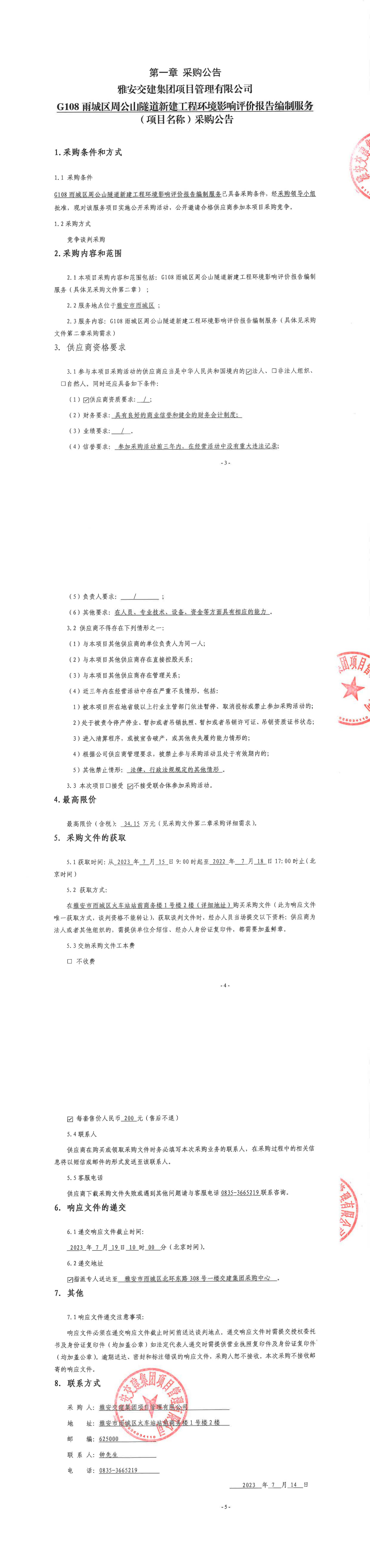 雅安交建集團(tuán)項(xiàng)目管理有限公司G108雨城區(qū)周公山隧道新建工程環(huán)境影響評價報告編制服務(wù)(項(xiàng)目名稱)采購公告