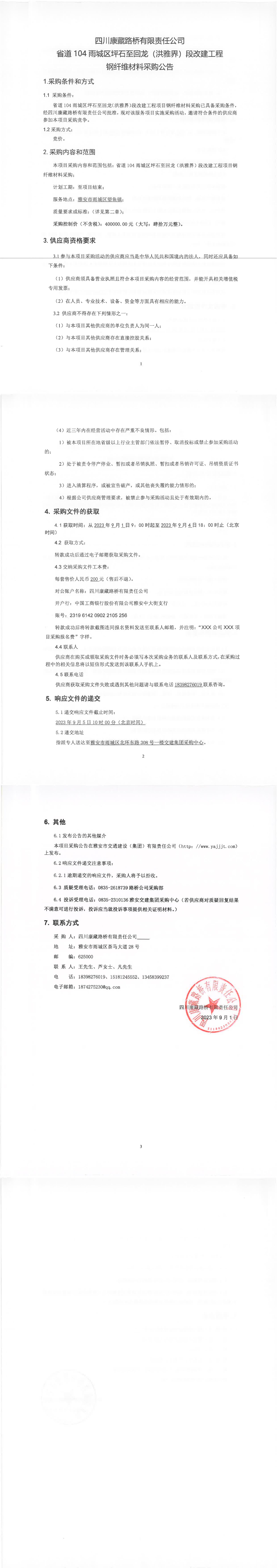 四川康藏路橋有限責(zé)任公司省道104雨城區(qū)坪石至回龍(洪雅界)段改建工程鋼纖維材料采購(gòu)公告