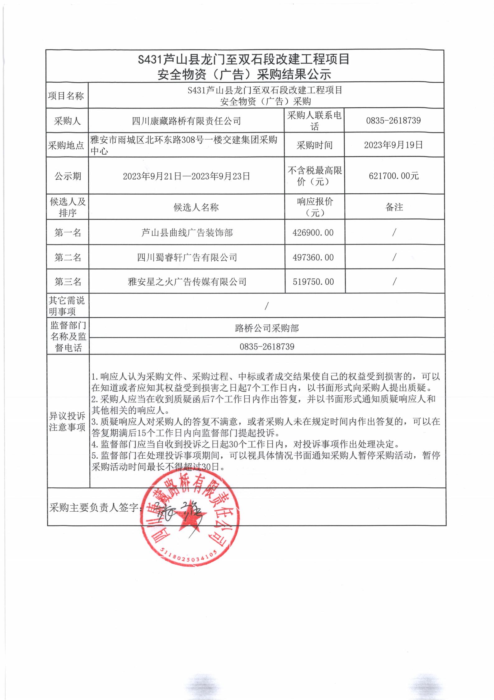 四川康藏路橋有限責(zé)任公司S431蘆山縣龍門至雙石段改建工程項(xiàng)目安全物資(廣告)采購結(jié)果公示