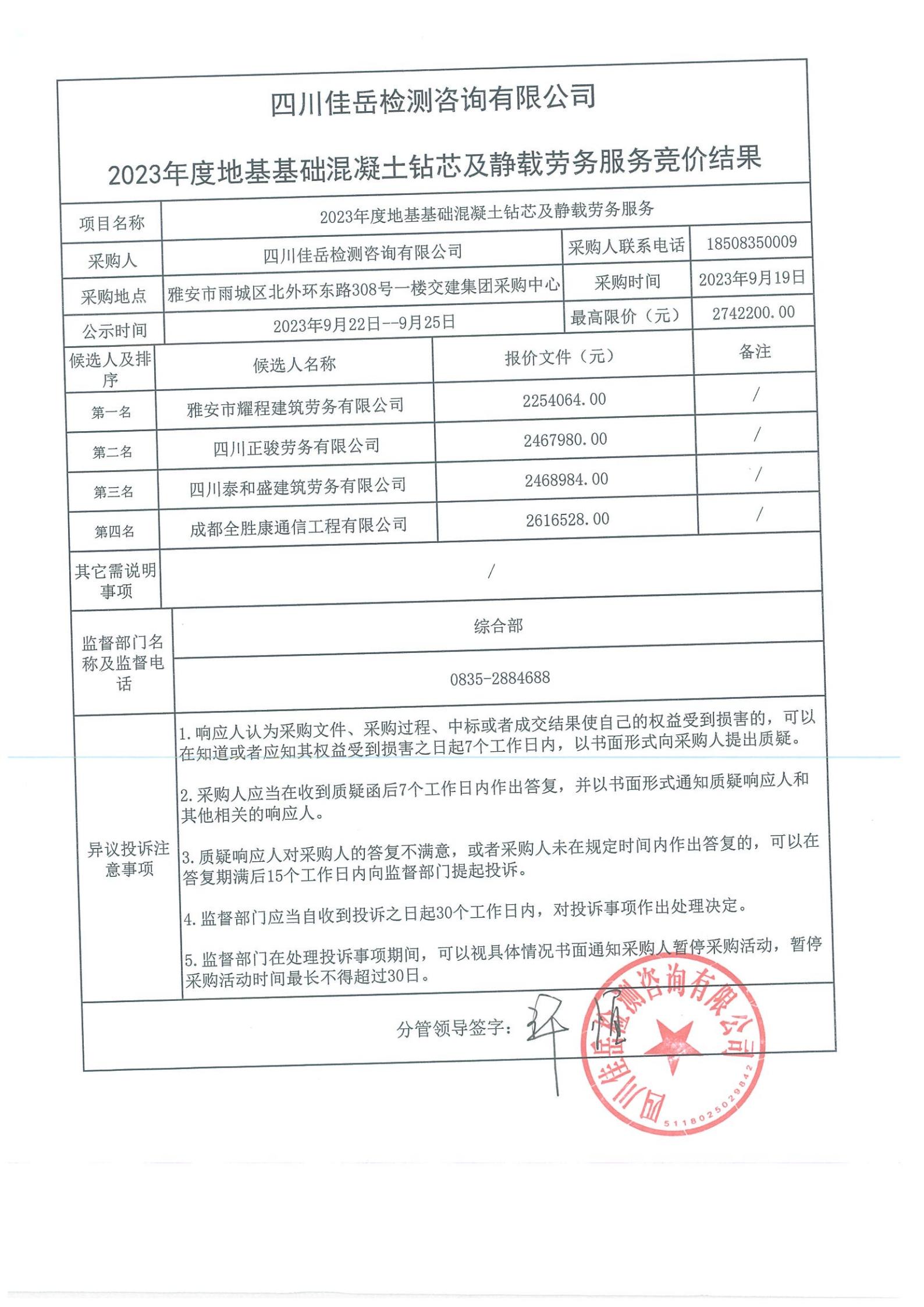 四川佳岳檢測咨詢有限公司2023年度地基基礎(chǔ)混凝土鉆芯及靜載勞務(wù)庫內(nèi)競價(jià)結(jié)果